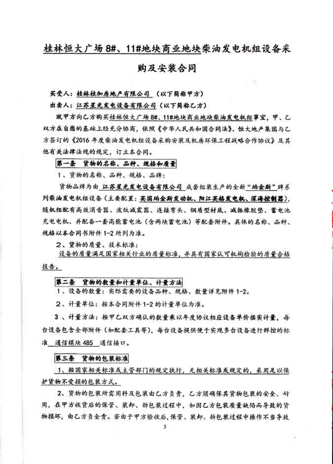 2016年4月5日,我公司發(fā)電機(jī)產(chǎn)品憑借精湛的技術(shù),優(yōu)良的品質(zhì)和完善的售后服務(wù)體系,成功與桂林桂加房地產(chǎn)有限公司簽訂桂林恒大廣場(chǎng)8#、11#地塊商業(yè)地塊珀金斯發(fā)電機(jī)組設(shè)備采購(gòu)及安裝工程合同,我公司為其提供1000KW柴油發(fā)電機(jī)組和1200KW柴油發(fā)電機(jī)組各一臺(tái),機(jī)組配置為珀金斯發(fā)動(dòng)機(jī)配英格發(fā)電機(jī)及深海控制器。發(fā)電機(jī)產(chǎn)品購(gòu)銷合同如下: