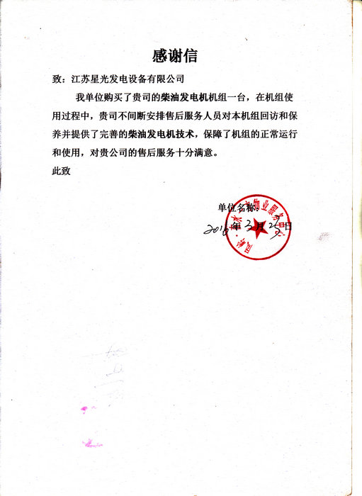 2016年3月23日,我公司收到鳳嶺·在水一方物業(yè)服務(wù)中心的感謝信,對我公司售后服務(wù)人員不間斷對柴油發(fā)電機組進行免費回訪,發(fā)電機組保修后反應(yīng)迅速,上門維修保養(yǎng)服務(wù)到位,認真的售后服務(wù)工作表示感謝!