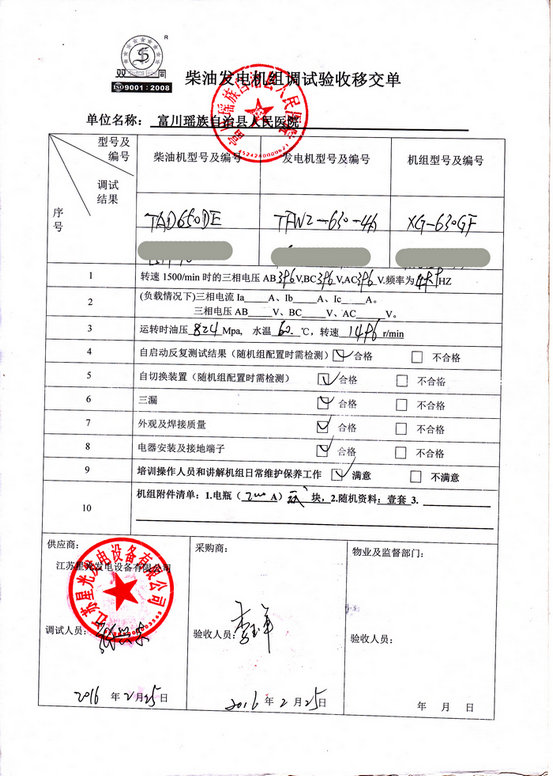 2016年2月25日,我江蘇星光集團發(fā)電機技術(shù)人員到富川瑤族自治縣人民醫(yī)院的柴油發(fā)電機組安裝現(xiàn)場,對我公司提供的630KW發(fā)電機組(機組配置:柴油機為里卡多發(fā)動機,發(fā)電機為星光發(fā)電機)進行調(diào)試交付工作,并為其培訓(xùn)操作人員和講解機組日常維護保養(yǎng)工作。以下是發(fā)電機組調(diào)試驗收單: