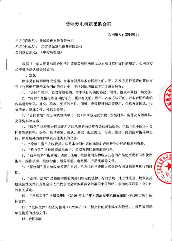 2016年1月31日,鹽城溫氏畜牧有限公司與我公司簽訂發(fā)電機組采購合同,我公司為其提供重慶康明斯柴油機配無錫斯坦福發(fā)電機及英國深??刂破鞯?strong>500KW柴油發(fā)電機組一臺,并負責機組的運輸安裝調試及發(fā)電機技術人員的培訓。發(fā)電機產品購銷合同如下: