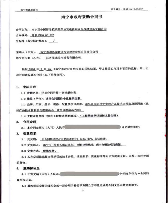 2016年8月,星光動(dòng)力集團(tuán)自主創(chuàng)新,生產(chǎn)的節(jié)能環(huán)保型發(fā)電機(jī)組憑借精湛的技術(shù),優(yōu)良的品質(zhì)和完善的售后服務(wù)成功與南寧市相思湖新區(qū)投資建設(shè)發(fā)展有限責(zé)任公司簽訂南寧三中國(guó)際學(xué)校項(xiàng)目柴油發(fā)電機(jī)組及母線槽設(shè)備采購(gòu)合同。