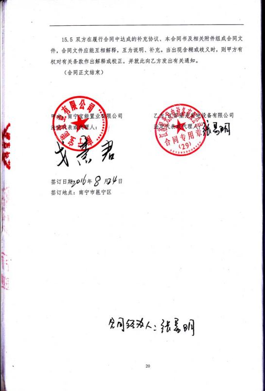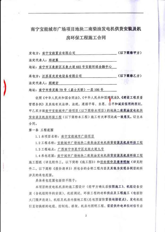 2016年8月24日,我公司成功與南寧寶能置業(yè)有限公司簽訂南寧寶能城市廣場項目地塊二南柴油發(fā)電機(jī)供貨安裝及機(jī)房環(huán)保工程施工合同。合同如下: