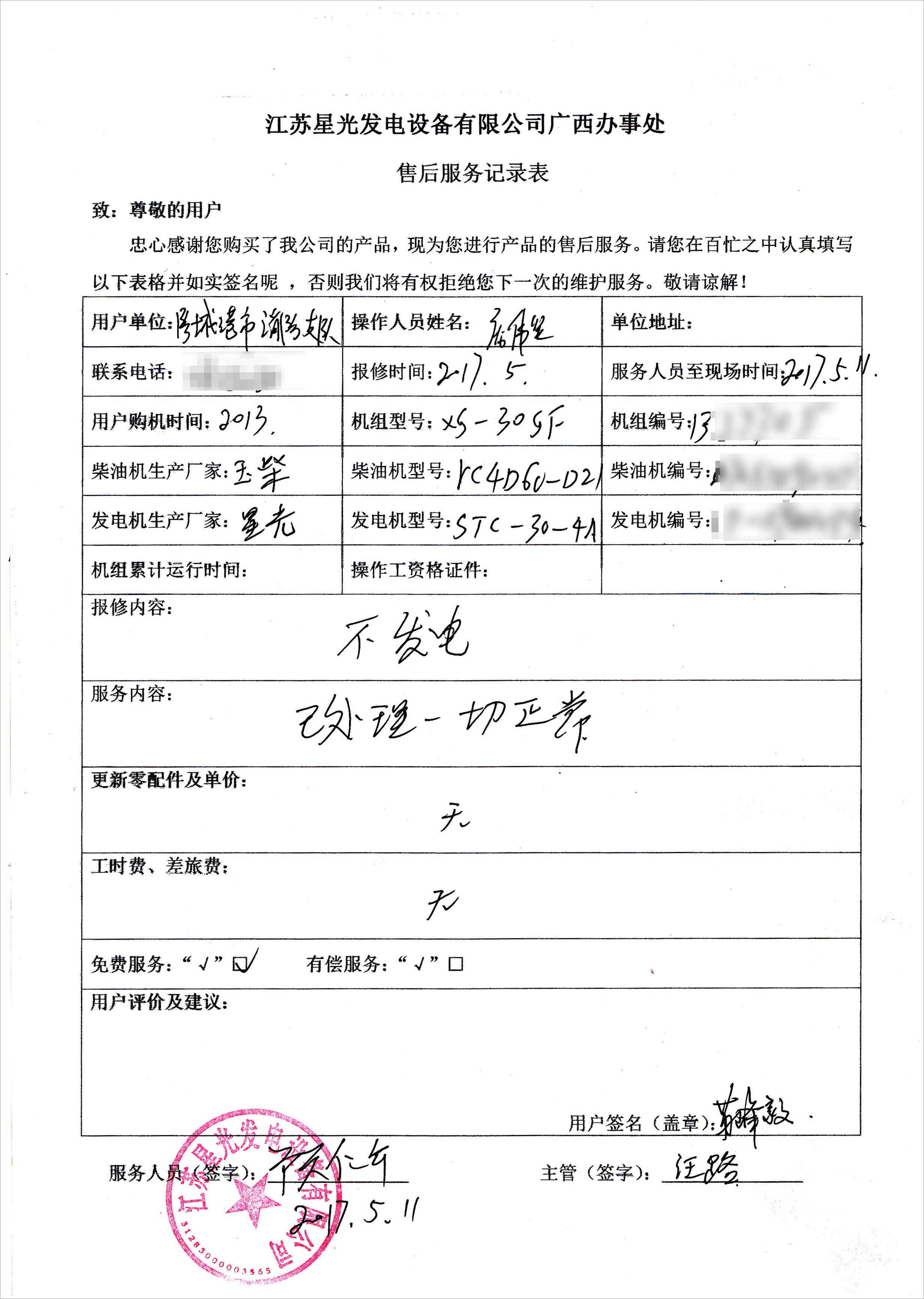 近日,我公司售后服務(wù)部接到防城港市消防支隊(duì)的報(bào)修電話。接到故障通知后,售后技術(shù)員顧師傅迅速到達(dá)用戶指定現(xiàn)場(chǎng)對(duì)這臺(tái)購(gòu)于2013年配置為玉柴柴油機(jī)配星光發(fā)電機(jī)的30KW玉柴發(fā)電機(jī)組進(jìn)行維保,針對(duì)用戶反映的不發(fā)電問題對(duì)機(jī)組進(jìn)行了詳細(xì)檢查,經(jīng)處理機(jī)組恢復(fù)正常運(yùn)行。