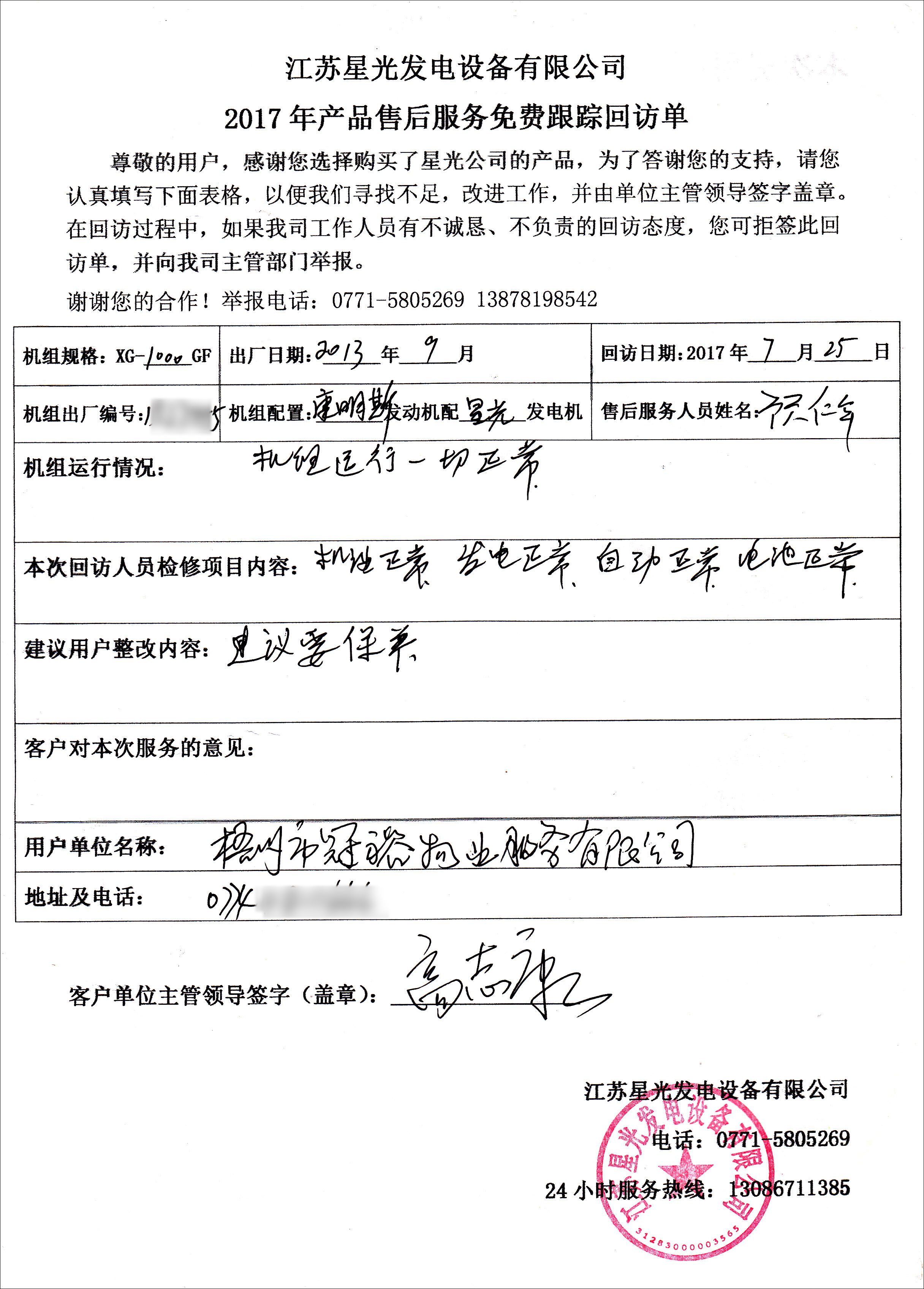 7月25日,我公司售后技術(shù)員顧師傅到梧州冠裕物業(yè)公司對(duì)其于2013年9月在我司購買的兩臺(tái)康明斯發(fā)電機(jī)組進(jìn)行免費(fèi)售后回訪服務(wù)。顧師傅檢查了機(jī)油、電池及機(jī)組自動(dòng)化、發(fā)電情況均正常。因機(jī)組已使用較長時(shí)間,顧師傅建議對(duì)機(jī)組進(jìn)行保養(yǎng),以確保機(jī)組正常運(yùn)行。更多關(guān)于康明斯發(fā)電機(jī)組售后服務(wù)歡迎撥打星光熱線:13878198542