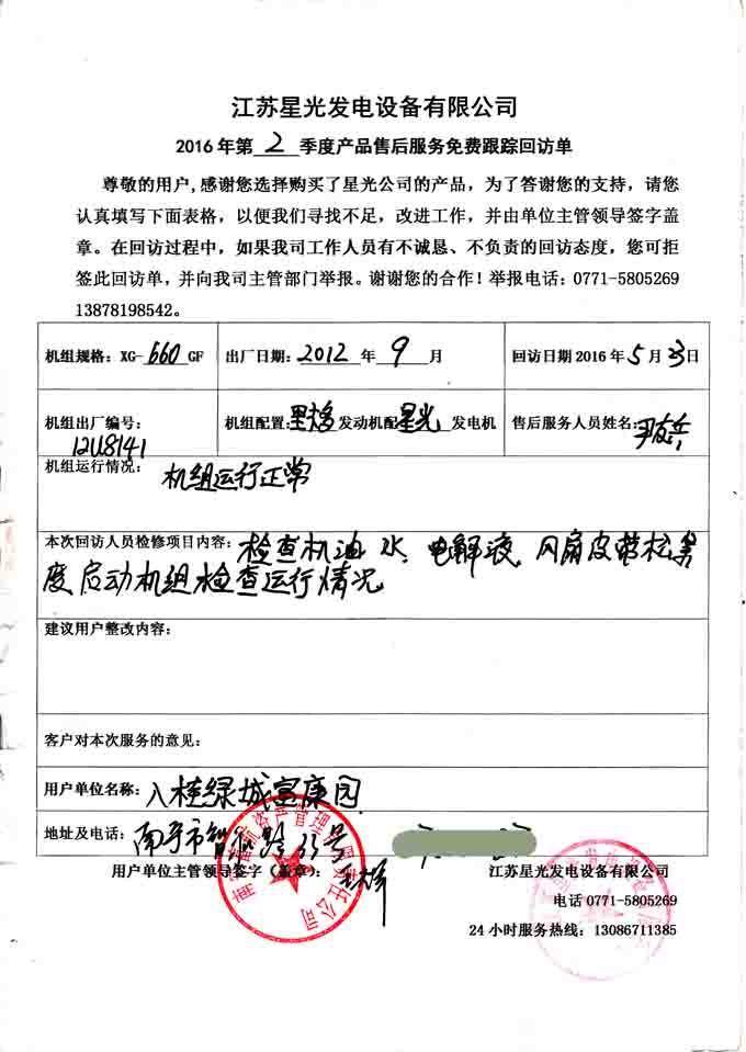 2016年5月23日,我星光動力集團(tuán)售后人員到八桂綠城富康園)對我公司為南寧富航資產(chǎn)管理有限責(zé)任公司提供的660KW柴油發(fā)電機(jī)組(配置為里卡多發(fā)動機(jī)配星光發(fā)電機(jī))進(jìn)行免費回訪。售后人員本次回訪主要的啟動機(jī)組檢測機(jī)組的運行情況,檢查機(jī)組的機(jī)油、水箱水、電解液,風(fēng)扇皮帶松緊度等。下面是本次回訪記錄: