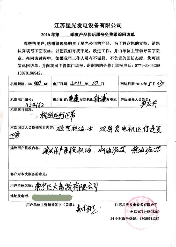 我公司技術(shù)人員本次回訪主要檢查機(jī)組的機(jī)油、水箱水及啟動(dòng)機(jī)組檢查機(jī)組的運(yùn)行情況,經(jīng)檢查機(jī)組運(yùn)行一切正常,但機(jī)組已長久運(yùn)行,建議用戶更換機(jī)油、機(jī)油濾芯、柴油濾等配件,做好機(jī)組保養(yǎng)維護(hù)工作。下面是本次回訪記錄:
