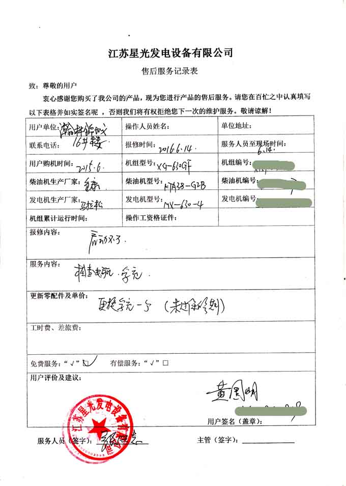 2016年6月14日,我公司售后服務(wù)部接到翰林錦城16#樓管理中心的報(bào)修電話,及時(shí)安排技術(shù)人員與其對(duì)接,到現(xiàn)場(chǎng)就報(bào)修的發(fā)電機(jī)組啟動(dòng)不了情況進(jìn)行檢修。經(jīng)檢查該機(jī)組為重慶康明斯柴油機(jī)配馬拉松發(fā)電機(jī)的630KW柴油發(fā)電機(jī)組,技術(shù)人員檢查了機(jī)組電瓶及孚充,發(fā)現(xiàn)為是孚充引起的故障,為用戶更換孚充,機(jī)組運(yùn)行已一切正常。以下是售后服務(wù)記錄表: