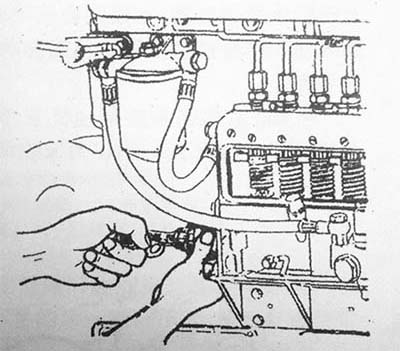 第一種方法:拆下第一缸的高壓油管,轉(zhuǎn)動曲軸,使第1缸活塞處于膨脹沖程始點,此時飛輪殼上的指針對準(zhǔn)飛輪上的“0”度線。然后反轉(zhuǎn)柴油發(fā)電機(jī)組曲軸,使檢視窗上的指針對準(zhǔn)飛輪上相當(dāng)于噴濺提前角規(guī)定的角度,然后松開噴油泵傳動軸接合盤上的兩個固緊螺釘,按噴油泵的轉(zhuǎn)動方向,緩慢而均勻地轉(zhuǎn)動噴油泵凸輪軸至第1缸出油口油面剛剛發(fā)生波動的瞬時為止,如下圖所示,并擰緊接合盤上的兩個螺釘。