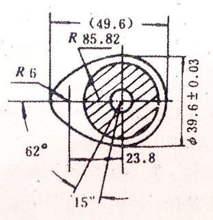 柴油發(fā)電機(jī)組凸輪軸如圖1所示,在軸的中心鉆有長(zhǎng)油孔與各檔軸頸相通,每相鄰兩軸頸之間有兩個(gè)凸輪,分別控制柴油發(fā)電機(jī)組的進(jìn)氣門(mén)和排氣門(mén)。凸輪的外形結(jié)構(gòu)尺寸如圖2所示。(注意:老的即未經(jīng)過(guò)改進(jìn)技術(shù)的增壓機(jī)型如6135ZG、12V135Z的凸輪外形結(jié)構(gòu)尺寸與此不同,不能通用。)