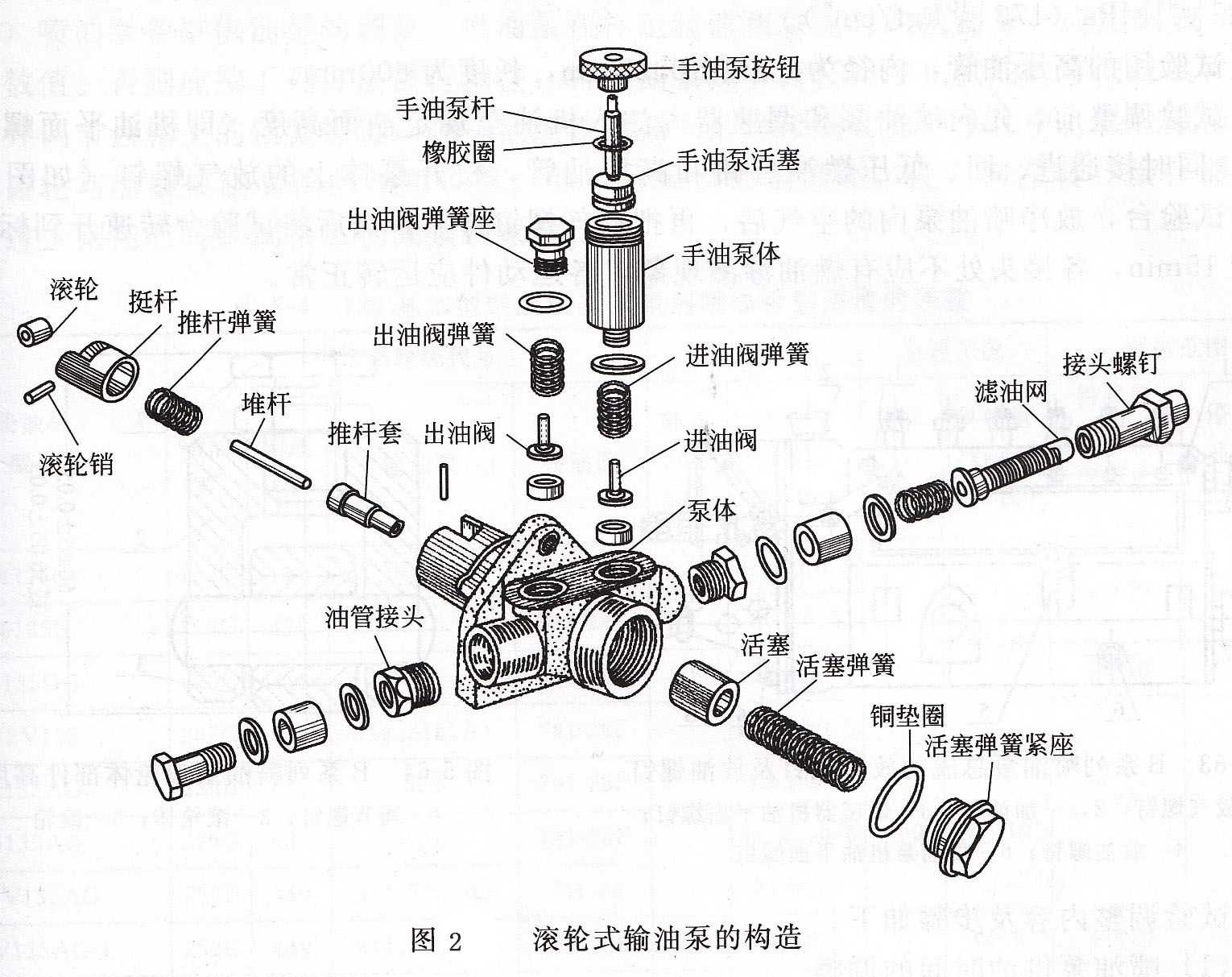 135系列柴油機(jī)4、6缸B系列和B系列強(qiáng)化噴油泵采用滾輪式輸油泵,如圖2所示。輸油泵的活塞與殼體的配合間隙為0.005~0.05毫米。間隙太大,供油率將下降。滾輪式輸油泵的頂桿與頂桿套也是經(jīng)配對(duì)互研的偶件,間隙太大同樣也存在著漏油的弊病。手油泵活塞與手油泵體之間有橡膠密封裝置,除非手油泵中的橡膠圈損壞,一般不拆動(dòng)。