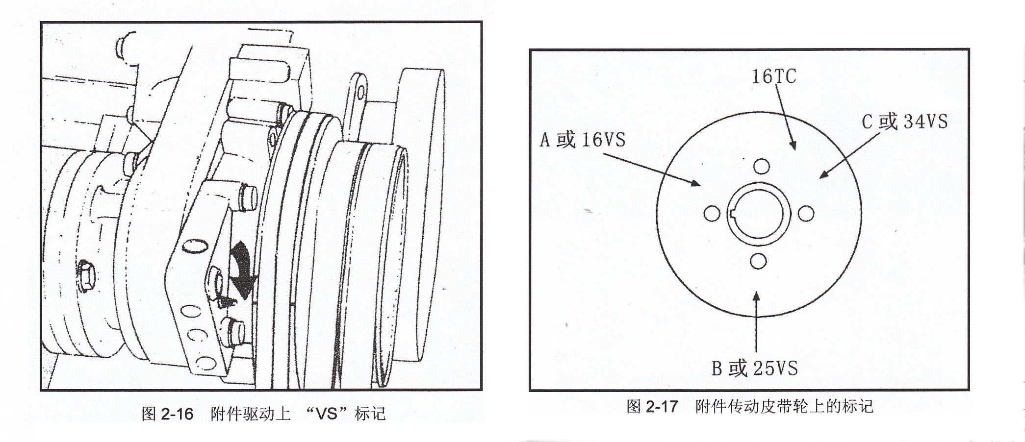 1、撬動(dòng)發(fā)動(dòng)機(jī)直到皮帶輪上“A”或1-6“VS”標(biāo)記和齒輪室蓋上箭頭對(duì)準(zhǔn),見圖2-16和圖2-17。在這位置上,第五缸的兩個(gè)氣門搖臂都是可以自由活動(dòng)的(氣門都在關(guān)閉狀態(tài))。第三缸噴油器柱塞在行程頂端如不是這樣,再將發(fā)動(dòng)機(jī)撬轉(zhuǎn)3600,重新對(duì)準(zhǔn)標(biāo)記和箭頭。