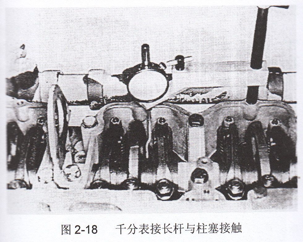 2、裝好3375842千分表和支架,使接長(zhǎng)桿位于柱塞上方(如圖2-18)。確保接長(zhǎng)桿裝于千分表頭部,且不能與搖臂相碰。
