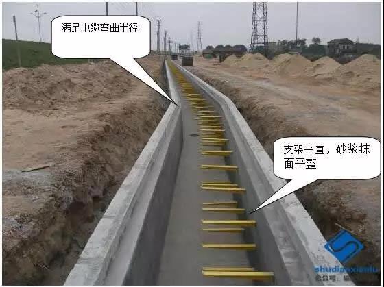 (11)質(zhì)量要求:磚砌電纜溝中心線偏差≤10mm(每段或每50m)、平整度偏差≤3mm、溝頂及埋件水平偏差≤3mm、溝壁截面尺寸偏差≤3mm;