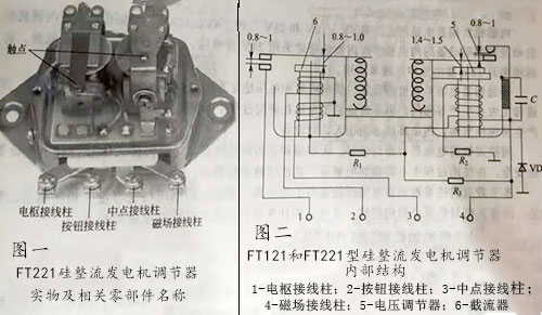 檢查各觸點(diǎn)間隙和氣隙(FT221型硅整流發(fā)電機(jī)調(diào)節(jié)器實(shí)物圖和相關(guān)觸點(diǎn)的間隙如圖一和圖二所示),若不符合要求,應(yīng)進(jìn)行調(diào)整。
