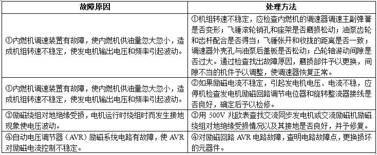 故障現(xiàn)象:機(jī)組啟動(dòng)運(yùn)行后,發(fā)電機(jī)空載或負(fù)載運(yùn)行時(shí)電壓(電流和頻率)忽大忽小。