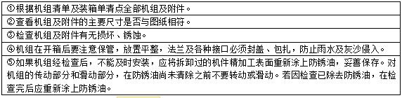 (2)開箱檢查 開箱之前將箱上的灰塵泥土掃除干凈,并查看箱體有無損傷,核實(shí)箱號(hào)及數(shù)量。開箱時(shí)要注意切勿碰傷機(jī)件。開箱的順序一般從頂板開始,在頂板開啟后,看清是否屬于準(zhǔn)備起出的機(jī)件。然后再拆其他箱板,如拆頂板有困難時(shí),則可選擇適當(dāng)處拆除幾塊箱板,觀察清楚后,再進(jìn)行開箱。開箱后應(yīng)做好以下幾項(xiàng)工作。