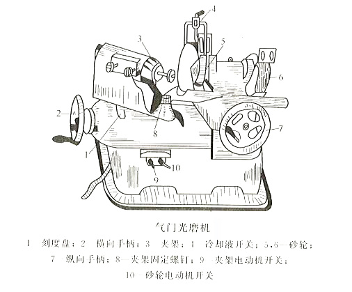 4、光磨。先開動夾架上的電動機,察看氣門是否有搖擺現(xiàn)象,氣門無搖擺時,再開動砂輪電動機進行光磨。
