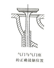 初鉸后,應(yīng)用光磨過的相配氣門進(jìn)行試配。其試配方法是:在氣門座錐形工作面上涂以紅丹油,放人導(dǎo)管中轉(zhuǎn)動(dòng)2~3圈(勿拍),然后拿出氣門觀察其接觸情況。正常要求是:接觸面應(yīng)在氣門工作斜面的中下部,進(jìn)氣門寬度約1.0~2.0mm,排氣門約1.5~2.5mm,接觸面過窄,影響密封和散熱,過寬容易積炭,而且不能緊密吻合。氣門與氣門座的正確接觸位置如下(圖)所示。在氣門錐形工作面的中下部,寬度為1.5~2mm。初鉸后的試配,如果接觸面偏上,應(yīng)用15°鉸刀鉸削上口,使接觸面下移,如接觸面偏下,應(yīng)用75°鉸刀鉸削下口,使接觸面上移,初鉸時(shí)應(yīng)盡量使氣門接觸面在中下部,應(yīng)邊鉸邊試配。為了延長氣門座與氣門的使用壽命,當(dāng)接觸面距氣門下邊緣1mm時(shí),即可停止鉸配。