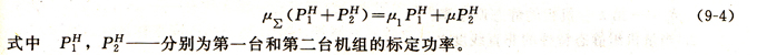 ”當量機組”的概念是指各同步并聯(lián)運行機組的總和。即虛構(gòu)一臺機組,其功率等于并聯(lián)運行機組的總和,轉(zhuǎn)速等于同步轉(zhuǎn)速,調(diào)整特性由各機組確定。對于負載承載數(shù)分別為μ1和μ2的兩臺機組,其當量機組的承載系數(shù)為μΣ,它所承受的功率為